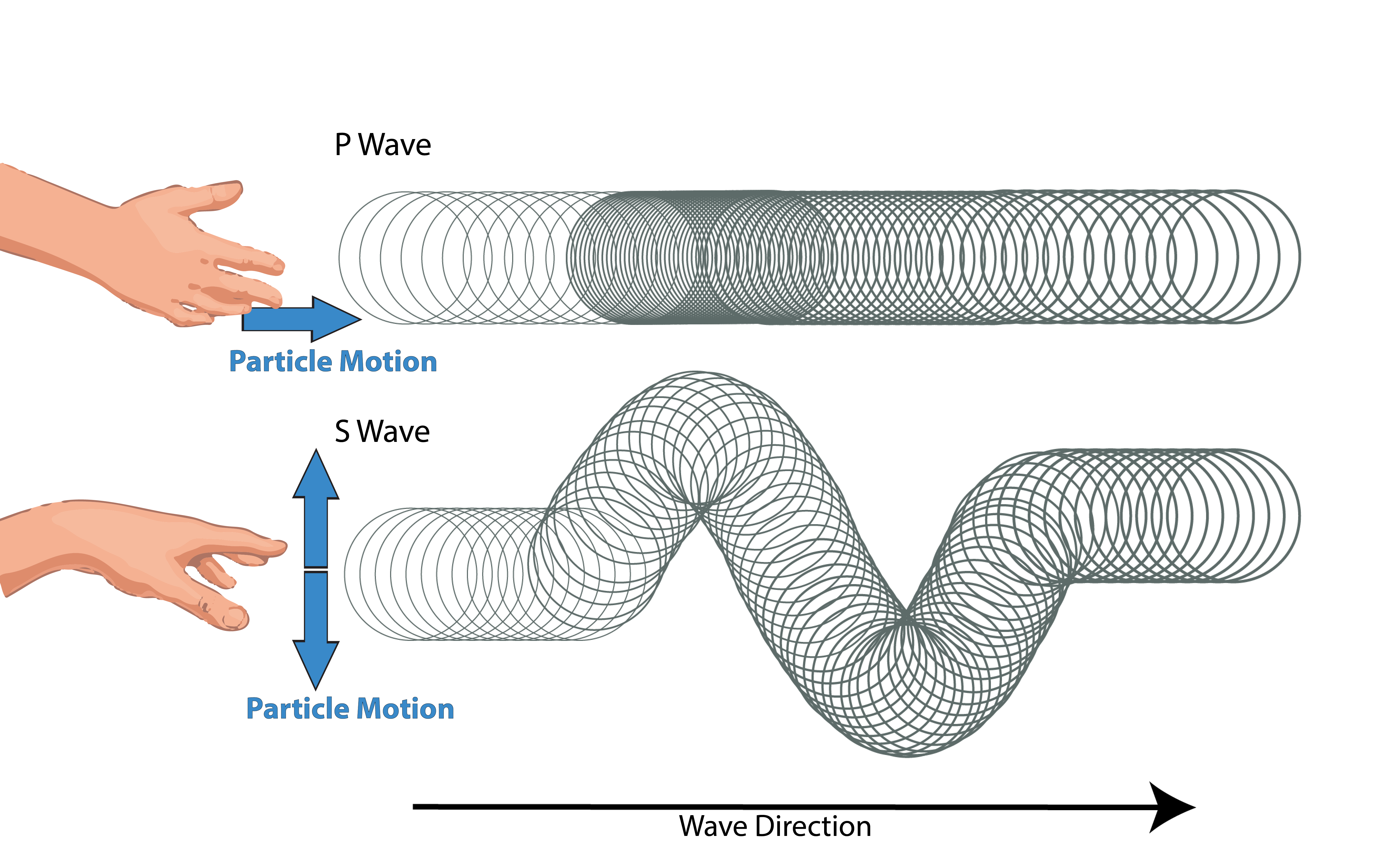 P waves are compressional waves. As P waves travel through matter, the matter alternatively compresses and expands. P waves travel through the earth, as much as sound waves travel through the air. A compressional sort of wave can be illustrated with a Slinky in (Figure 6).
