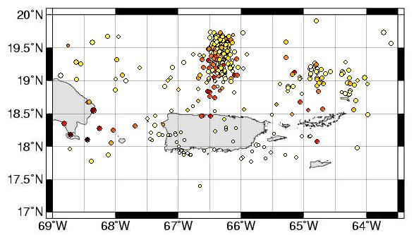 A smaller earthquake that follows the main earthquake within the same region. Aftershocks can continue over a period of weeks, months, or years. In general, the larger the main shock, the larger and more numerous the aftershocks, and the longer they will continue. In the earthquake of October 11, 1918 in Puerto Rico, aftershocks continued for up to six months. The most severe of them occurred on October 24th at 11:43 p.m. and November 12th at 5:45 p.m. A more recent example took place on November 2, 2008, in which an event of magnitude 5.5 (Mw) was recorded in the Trench of Puerto Rico, generating a total of 369 aftershocks.