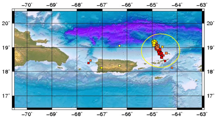 Swarms are many seismic events that occur in the same area with the same characteristics (similar magnitudes) in a given period of time. In our area, for example, twelve swarms were generated in the region of Puerto Rico and the Virgin Islands in 2011. One of these swarms occurred in the Sombrero Seismic Zone and the platform of Virgin Islands, from the 14th to the 15th of July, 2011. For more information please refer to the official report of the Puerto Rico Seismic Network at the following link:http://redsismica.uprm.edu/Spanish/sismos/repanual.php