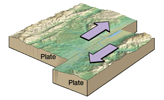 A region where two plates slide horizontally past each other is a transform boundary. Transform boundaries are characterized by long faults, sometimes hundreds of kilometers in length, and by shallow earthquakes. Transform boundaries were named for the way Earth's crust changes, or transforms, its relative direction and velocity from one side of the boundary to the other.