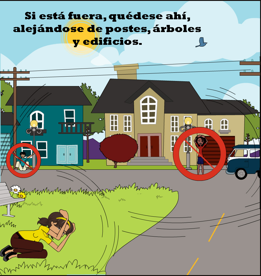 If you are outside of a building, it’s recommended to stay out of it. It’s recommended to look for an open place and protect yourself by dropping and covering yourself. You must stay away from poles, power lines, structures that can collapse and passable roads. See fig. 3. Remember to move carefully to the open area, considering that there may be live electrical wires or glass on the floor.