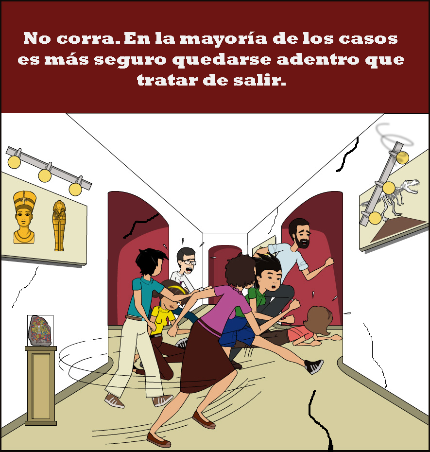 Drop, Cover and Hold On! These three simple steps are the most recommended to save your life and avoid injuries during the onslaught of an earthquake. Always wait for it to stop shaking; then proceed to take the necessary actions established in your emergency plan, keeping calm.
