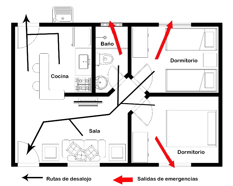 ✓ Others considerations: During an earthquake, avoid hazardous places like, for example: glass windows, glass doors or showcases, stairs, bookshelves or shelves without securing, standing under hanging objects, near volatile materials or explosives, electrical cables and under door frames, among others. If you are in a building, do not use the elevators (the electric services may be affected). On the other hand, you can make your environment a safer one. It is advisable to anchor heavy furniture to the walls (eg cabinets, bookshelves, etc.) and to attach frames and other objects to the walls and shelves, as applicable, and place heavy objects at low height You can also make sure to keep the spaces clear of obstacles (doors and corridors) in order to allow easy access. If you have portable emergency supplies (eg backpack), you can place them near the exits of the structure, which should also be clear of obstacles. Finally, it would be useful to draw a map of the structure, detailing evacuation routes to the nearest exits.