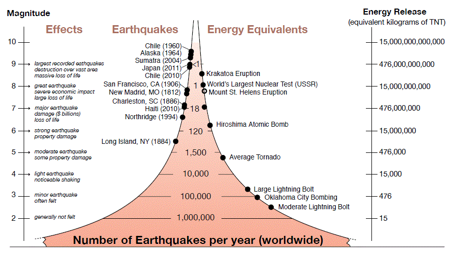 The following image shows how frequent an earthquake occurs according to its magnitude in a year and a comparison of the energy released with different events.