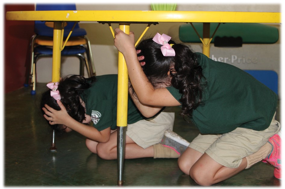 (Image 2). "Drop, Cover and Hold", the safest mode of protection suggested and accepted by the USGS, American Red Cross, and FEMA. Photo taken by RSPR.