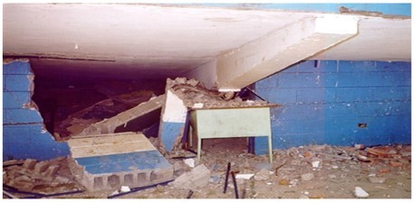 Pictures taken at a school after an earthquake in Cariaco, Venezuela. The Cariaco earthquake occurred on July 9, 1997, with a depth of 20 km and a magnitude of 6.8. In the first picture you can see that the area under the desk is safer than the area around it. In the bottom photo, a top floor collapsed and the ceiling was stopped by desks. The area under the desks remained intact and free of debris.