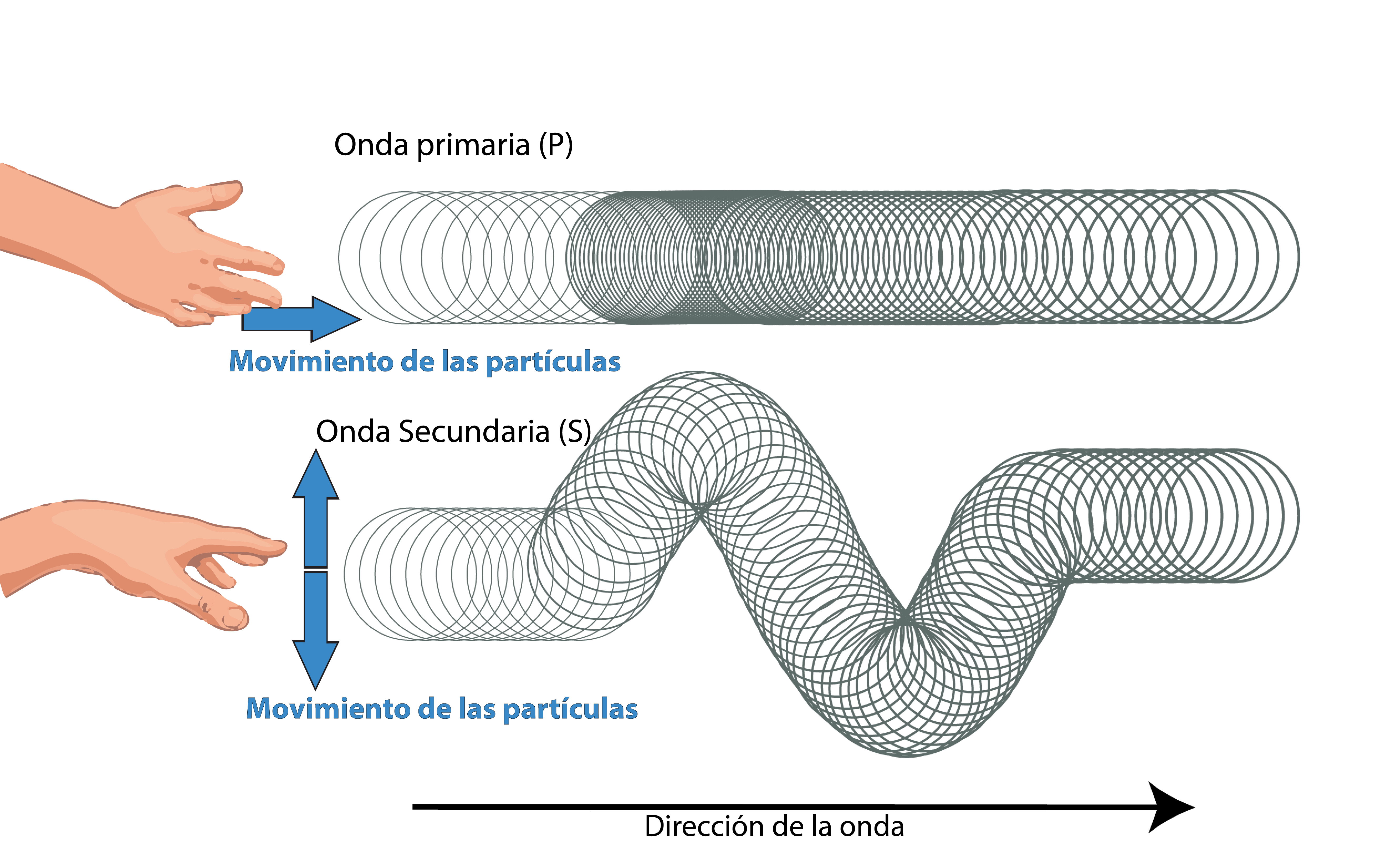 Las ondas P son ondas de compresión. Cuando estas viajan a través de la materia, las mismas se extienden y comprimen alternadamente. Las ondas P viajan a través de la tierra, así como las ondas de sonido viajan a través del aire. Este tipo de onda de compresión se ilustra con el Slinky en la parte superior de la Figura 6.