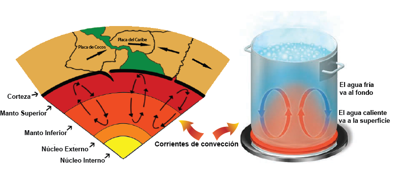 Figura 2.Imagen de las diferentes capas de la Tierra y las corrientes de convección que transforman la corteza terrestre. (representado por la analogía de la olla hirviendo).